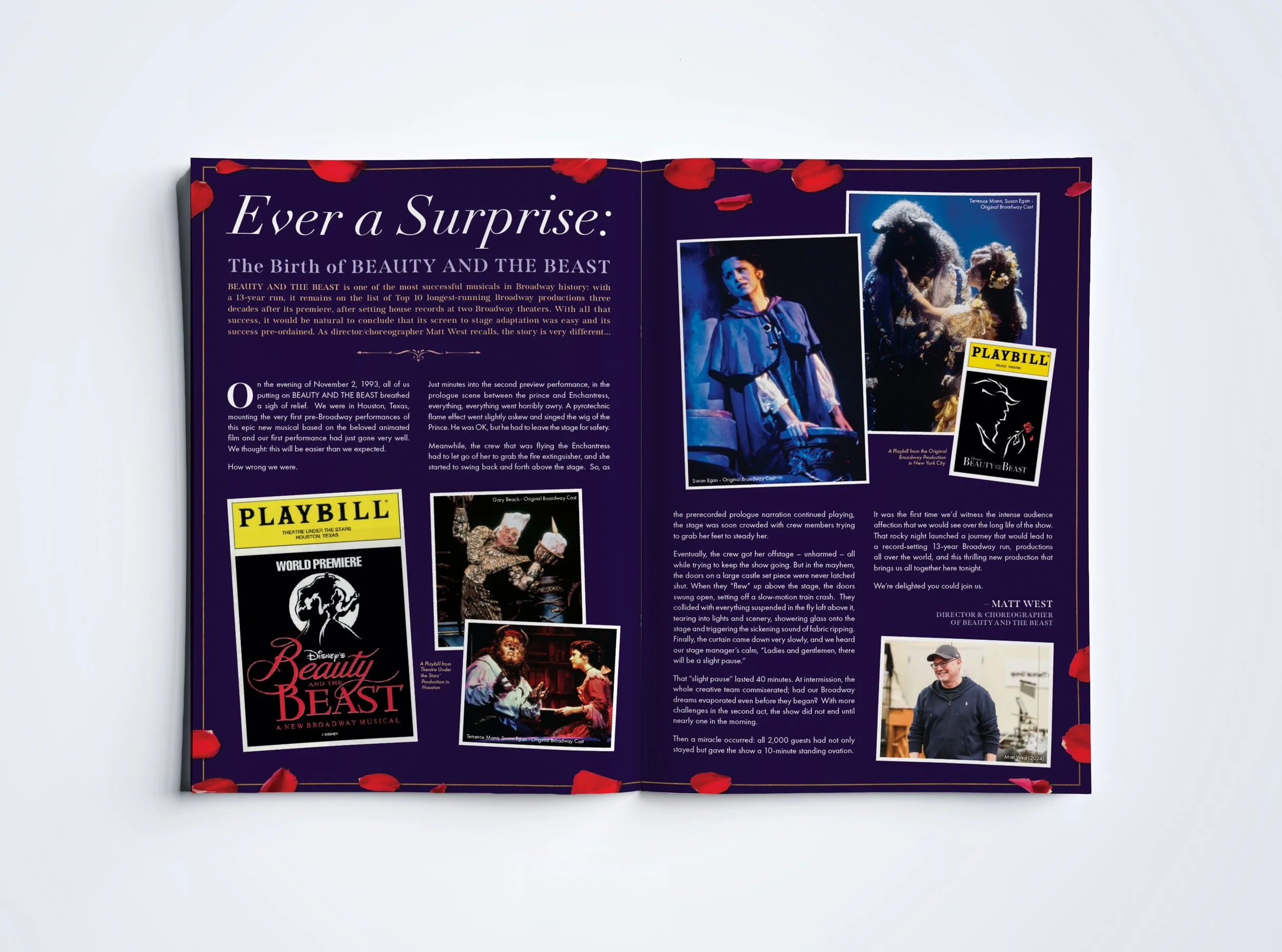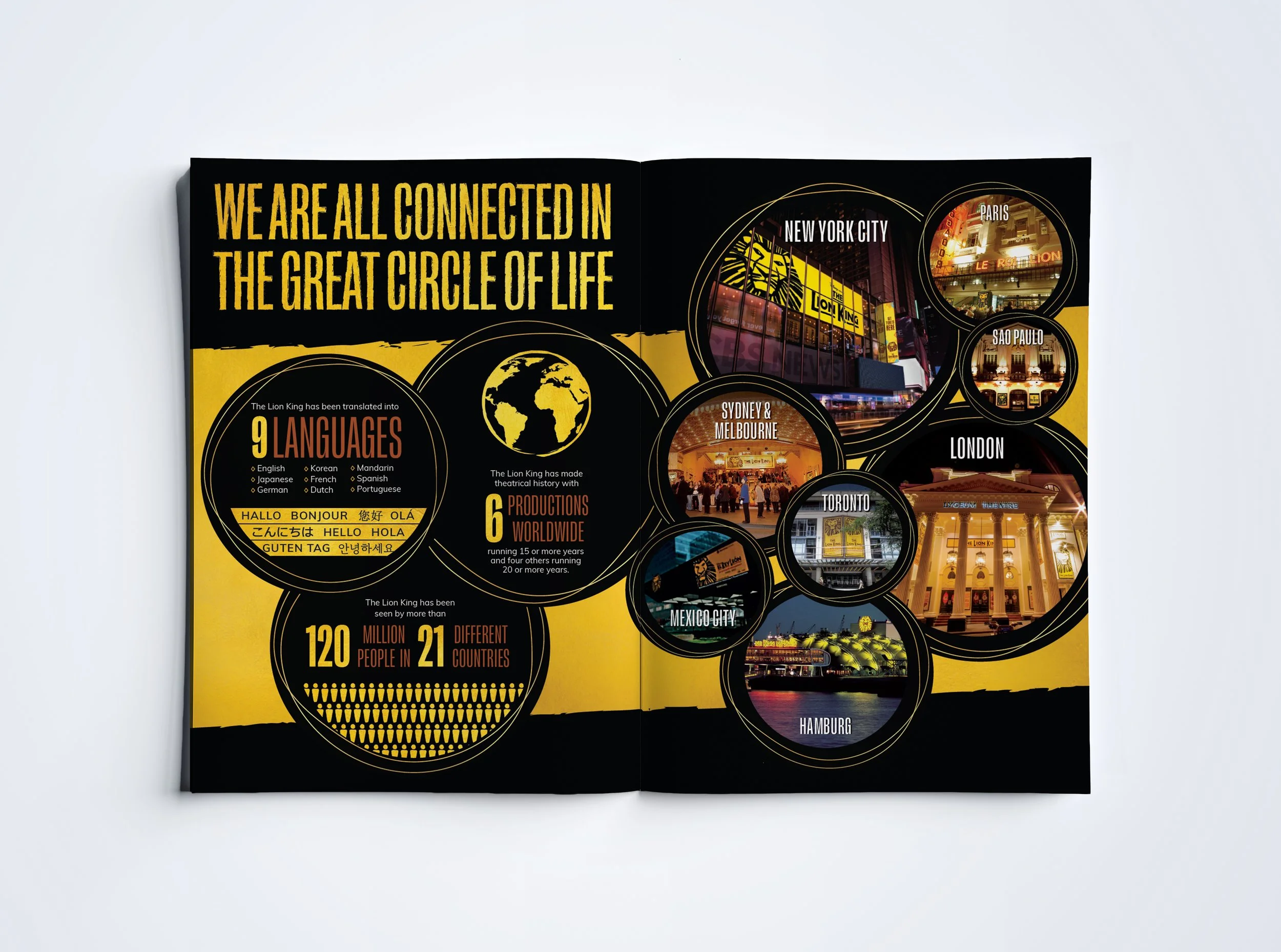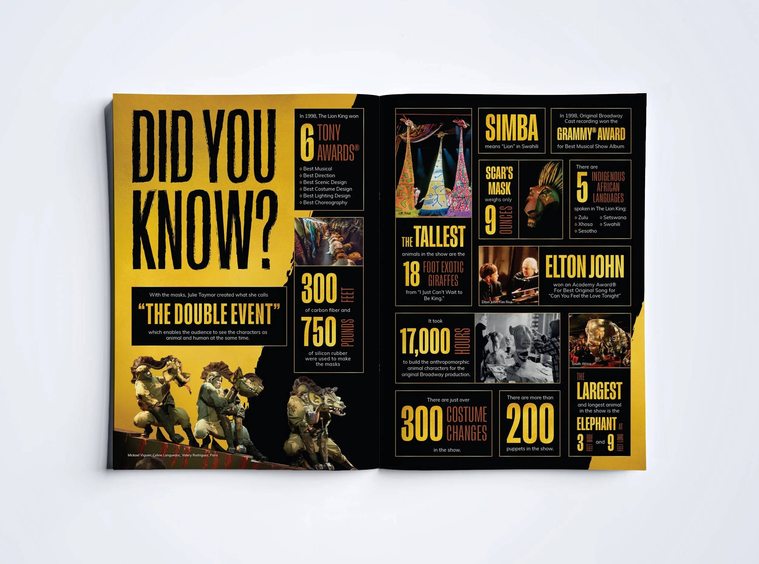 Souvenir brochures are a pivotal part of the guest experience and create a lasting memory of a performance. The goal when building a brochure from scratch is to capture the essence of a moving, breathing production and add to guests’ understanding of the history or craft. I worked closely with my team to build the structure of the book first, establish a layout, create and gather the artwork elements, and refine the details.