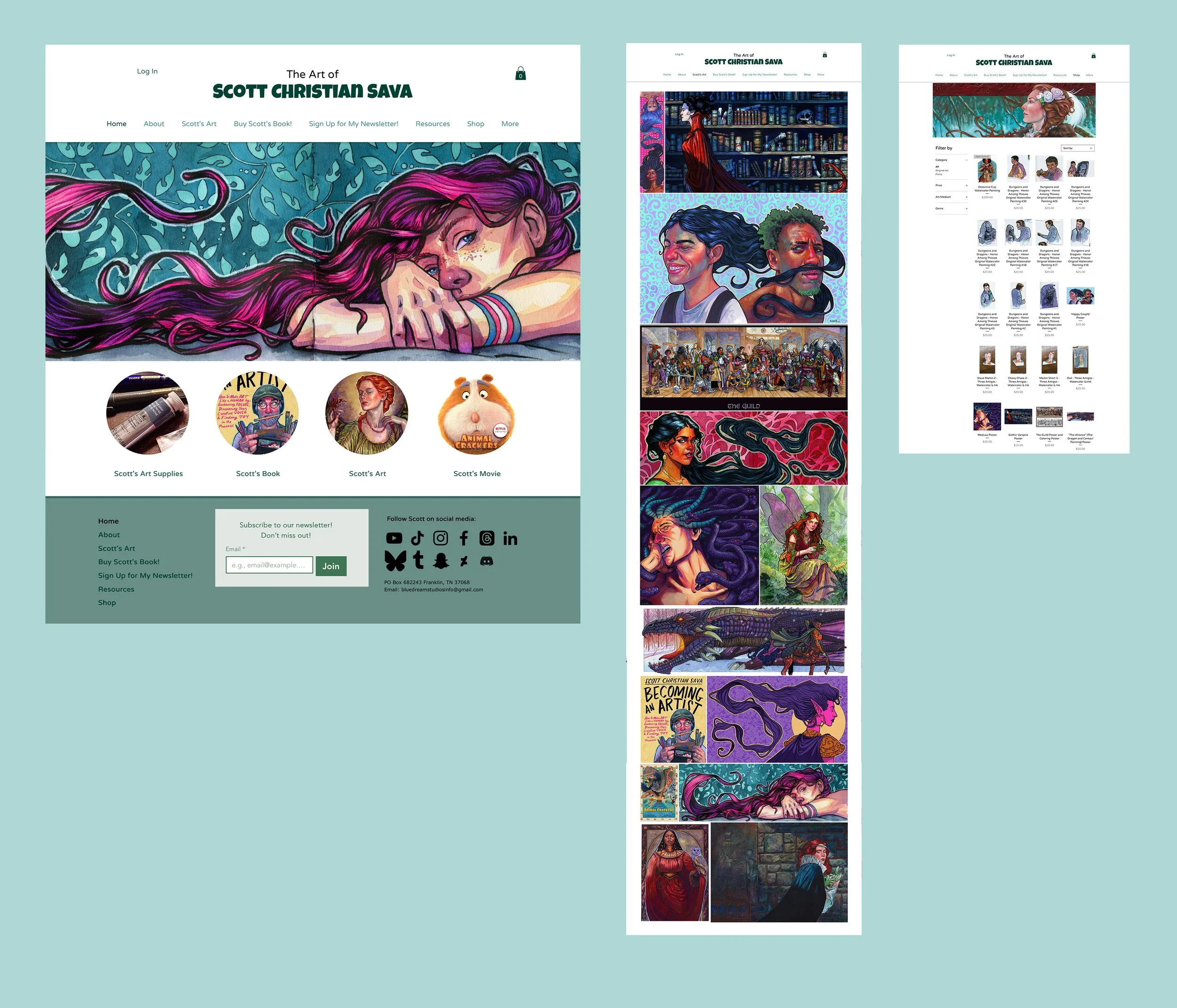 Artist Scott Sava has a huge internet presence with nearly 2.4 million followers on Youtube and over 500 thousand followers on Instagram for his insightful advice and openness to sharing tips and tricks to help artists of all capabilities. He is also a filmmaker and author, leaving him and his producer Donna Sava with many types of projects under their company Blue Dream Studios, including fan favorite Dreamland Chronicles and Netflix’s Animal Crackers. Both of these websites needed to function separately – one to support Scott’s art presence and include a shop for his original pieces and prints, and one to support all of Blue Dream Studios’ projects for industry purposes.